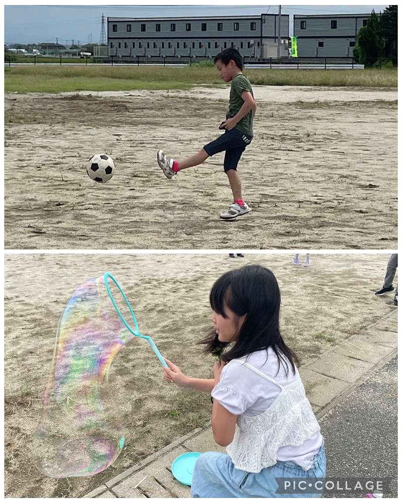 スポーツ教室は公園に行ってサッカー、シャボン玉、ランニングなど様々な運動にチャレンジしてました。