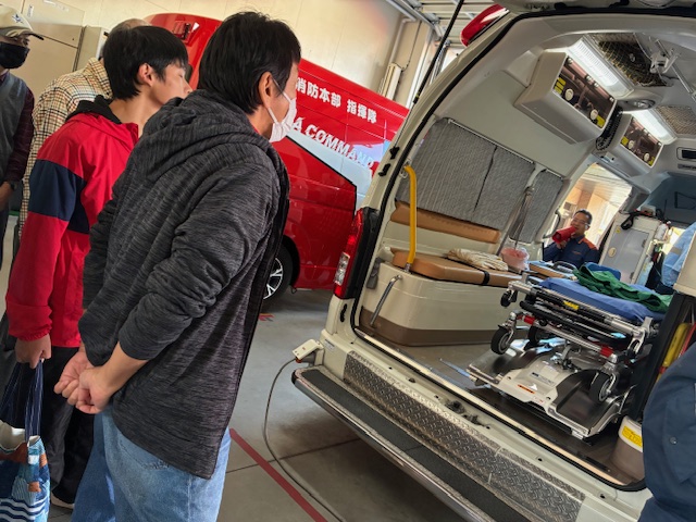 “消防車”と言っても指揮車、ポンプ車、はしご車、化学車などいろんな種類がありました。それぞれの消防車両の中を見せて頂いたり、日頃の仕事や訓練内容のお話を詳しく聞く事が出来て、利用者さんにとって貴重な経験が出来たと思います。